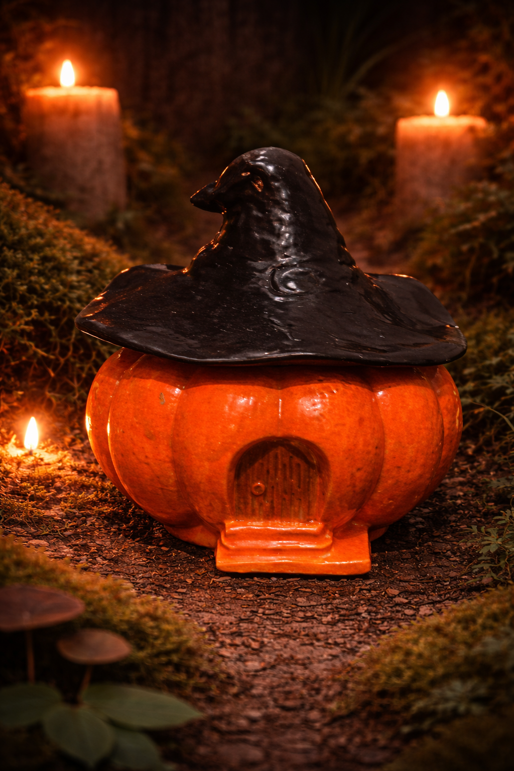 Uma casa de abóbora com chapéu de bruxa, no meio da floresta.